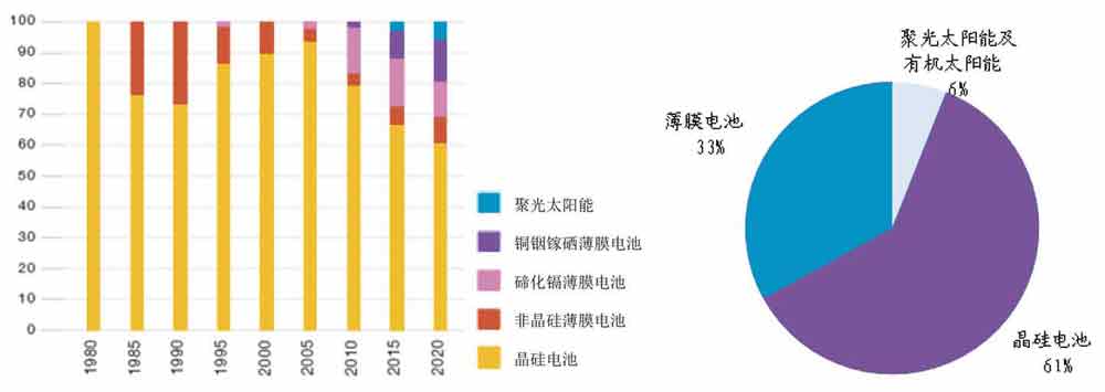 太陽能電池技術(shù)市場(chǎng)份額趨勢(shì)。(資料來源:EPIA)
