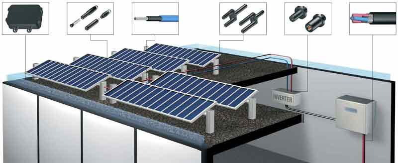 為使太陽能裝置能運(yùn)轉(zhuǎn),所有部件必須連接到一起。為達(dá)到這一目標(biāo),需要使用大量電纜、連接器和接線盒(solar junction box),具體要求是接觸電阻盡可能小,使傳輸中電能損耗最小。其它部件包括連接器、插座、電源輸出口、管道,甚至于設(shè)備的五金部件和終端都必須適合安裝和運(yùn)轉(zhuǎn)的要求。
