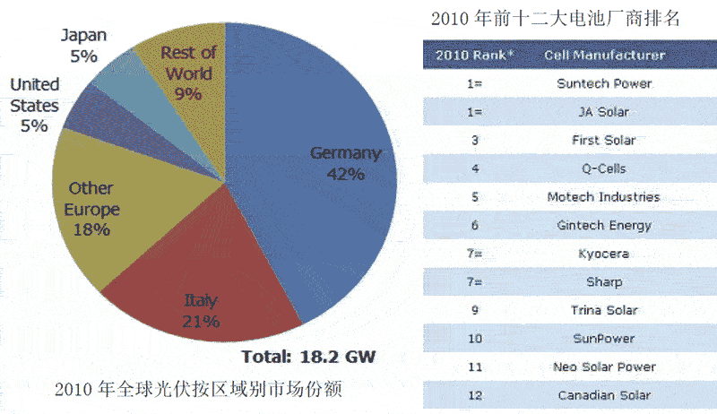 2010年全球光伏區(qū)域市場(chǎng)份額及前十二大電池廠商排名(資料來源:Solarbuzz)