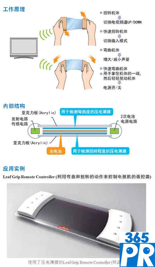 通過分別使用能夠檢測(cè)出彎曲度、扭轉(zhuǎn)程度的壓電薄膜,此應(yīng)用裝置是能夠通過用雙手彎曲和朝相反方向扭轉(zhuǎn)薄膜型機(jī)體來操縱電視機(jī)的新感覺遙控器。同時(shí),由于此遙控器安裝了可將光能轉(zhuǎn)換成電能的光電池,不需要使用電池。利用新產(chǎn)品,只要用雙手彎曲或朝相反方向扭轉(zhuǎn)薄膜型遙控器機(jī)體,就可操縱電視機(jī)了。