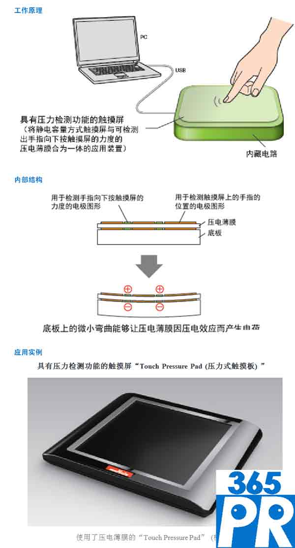 此次開發(fā)了2個(gè)使用該有機(jī)壓電薄膜的應(yīng)用裝置:即能夠利用彎曲和扭轉(zhuǎn)的動(dòng)作來控制電視機(jī)的遙控器“Leaf Grip Remote Controller”,以及能夠檢測(cè)出手指向下按觸摸屏的力度的具有壓力檢測(cè)功能的觸摸屏“Touch Pressure Pad(壓力式觸摸板)”。