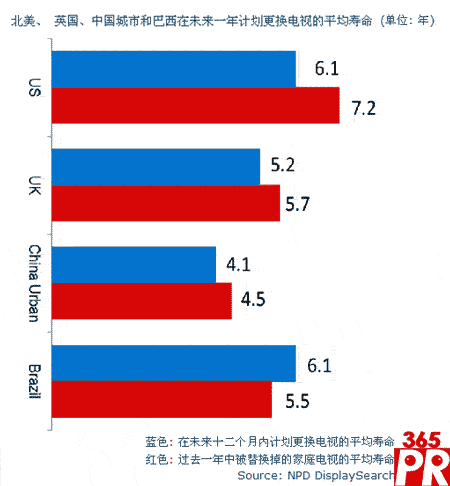 . 主要的家用電視平均壽命在4到7年之間,印度使用年限最久為6.7年,而中國城市的電視使用年限最短。