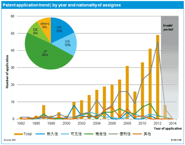 鑒于此,IHS發(fā)行了有關“汽車用觸控傳感器”的核心專利分析報告。本報告通過調(diào)查觸控面板行業(yè)、電子以及汽車企業(yè)申請的有關汽車用觸控傳感器的耐久性、可視性、穩(wěn)定性、便利性以及其他相關技術的專利,以定量方式觀察了專利申請動向,繼而以技術領域別選定針對汽車用觸控傳感器技術的核心專利來進行下一步的深層分析與結果,以利掌握“汽車用觸控傳感器技術”領域的開發(fā)動向或觀察核心專利技術時提供莫大的裨益。
