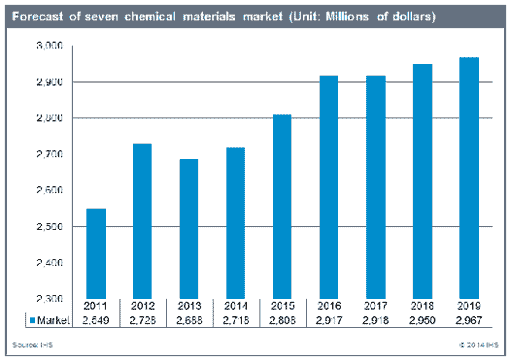 7個主要材料在2014年的市場規(guī)模約達(dá)到27億美金規(guī)模